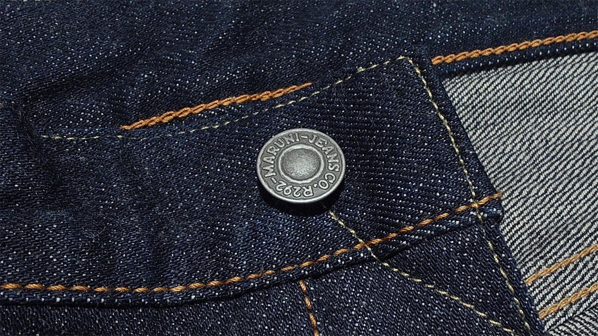 トップボタンには、ブランド名を刻印したアルミ製オリジナルボタンを使用。リベットも同様に刻印入りの銅製オリジナル打ち抜きリベットを採用し、細部まで一貫した世界観を構築しています。