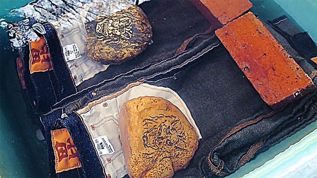 妙高山系から湧き出る地下水は、通常の約7倍の鉄分を含有。この水にジーンズを漬け込むことで藍と反応し、より濃く深みのある鉄紺色へと変化します。